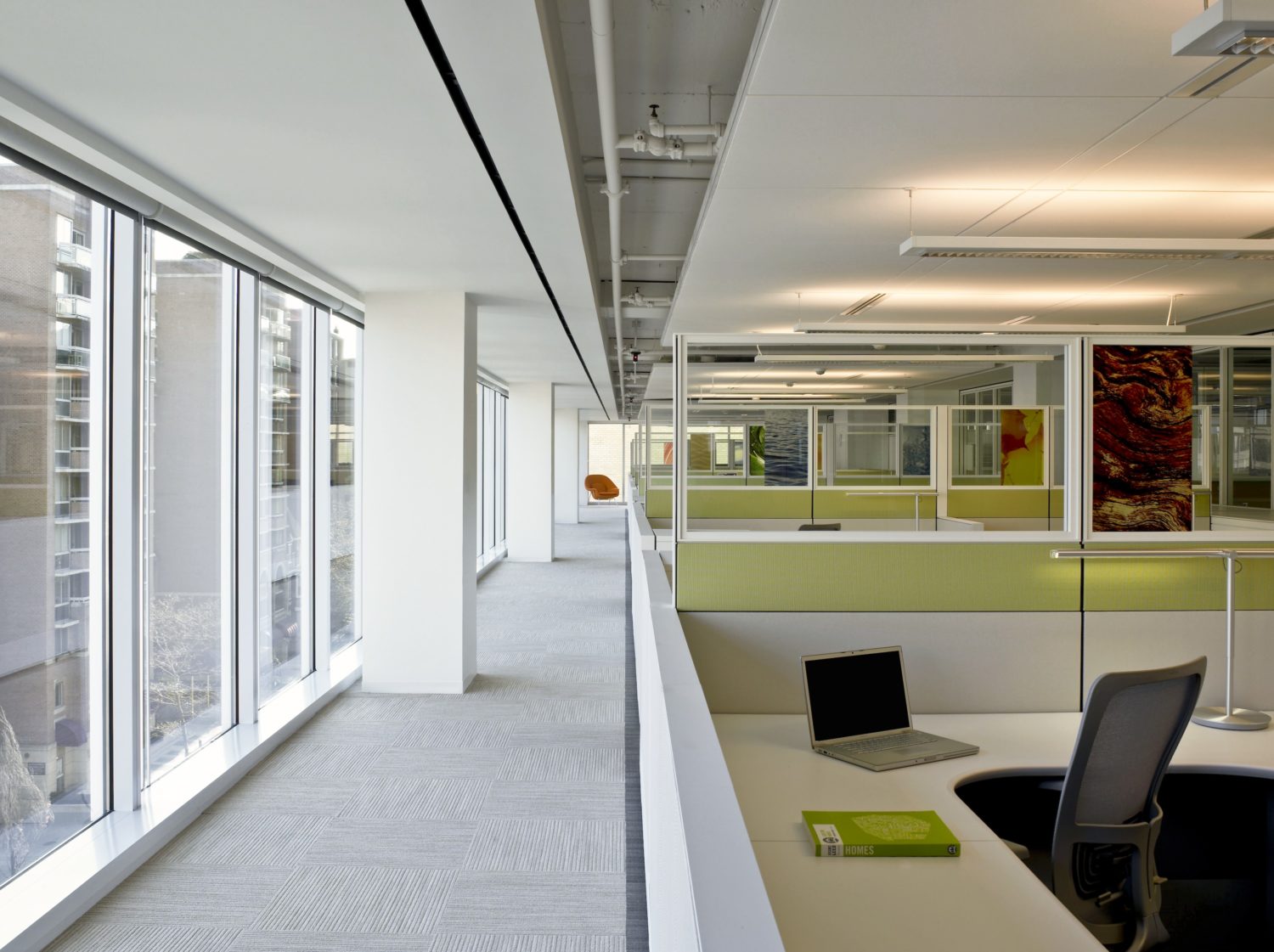 The project team took the perimeter floor-to-ceiling glass into close consideration during design stages and optimization of the lighting and shading systems. Office desks were pushed six feet from the perimeter, democratizing access to views while lowering heating and cooling requirements around the perimeter. Lightly colored flooring options were specified to form light shelves, reflecting daylight deep into the office space. If sun caused too much glare, Mecho’s SolarTrac shades automatically lowered to dampen exposure, given solar penetration allowances programmed into the algorithm. This perimeter design, dubbed the “eco-corridor,” allowed Facilities to take full advantage of day- lighting while minimizing conditioning demands at the periphery of the building.